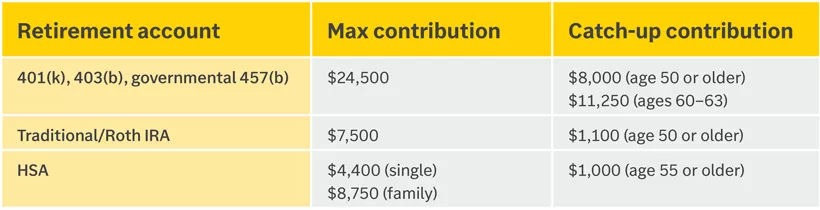 With an increased savings rate, you can help catch up on your retirement savings or give them an early boost. When invested, these increased savings have the potential to grow to even greater amounts. And with retirement account tax savings, it may provide some flexibility later if you need to reduce your savings rate or retire early.