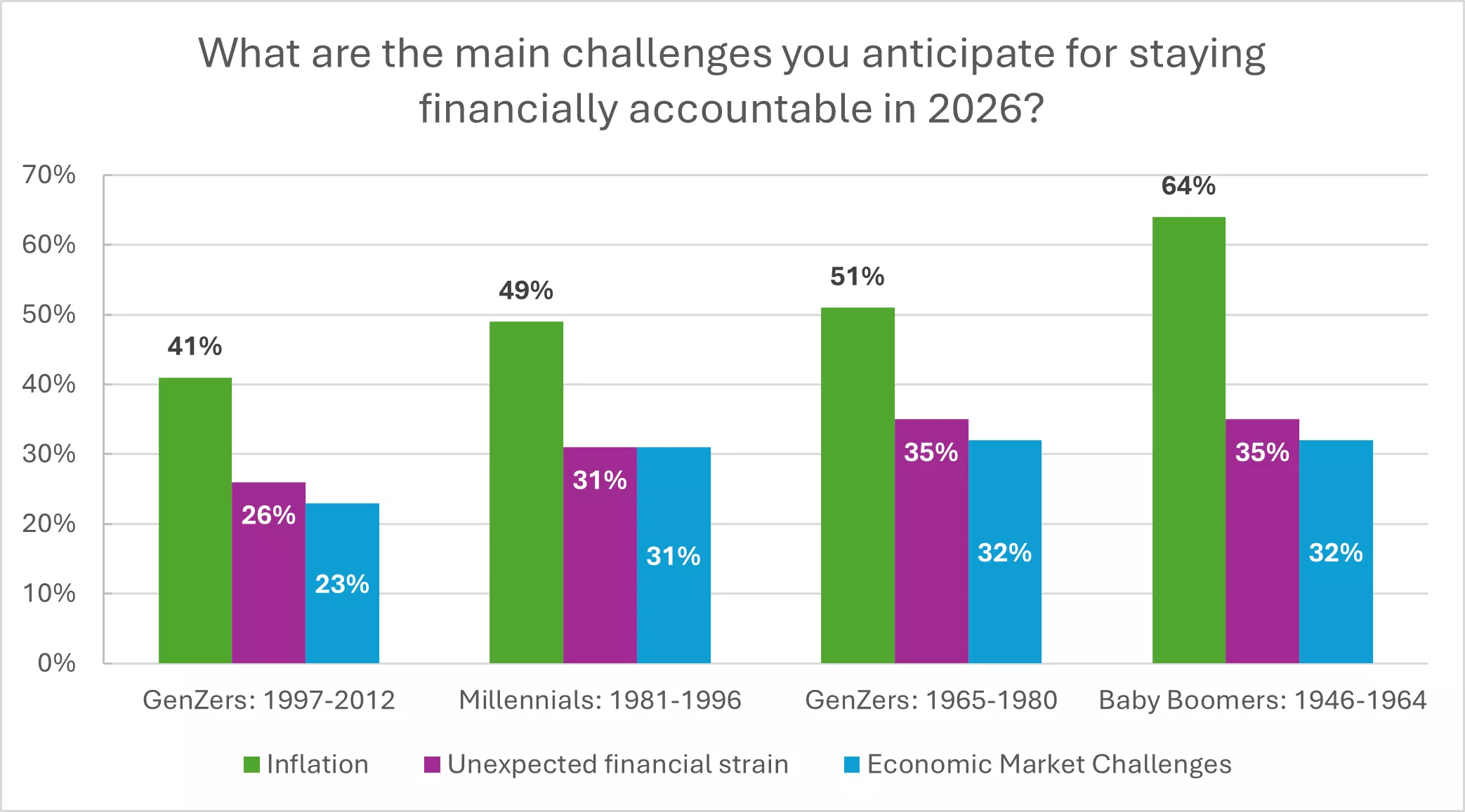 The survey revealed that inflation continues to influence Americans’ financial lives. It was cited as the top reason people couldn’t maintain their 2025 resolutions (49%) and remains the biggest anticipated obstacle for 2026 (52%). And the majority (82%) say it’s impacting their daily life, especially grocery spending (69%) and saving (62%), driving shifts in everyday spending habits and prompting consumers to make tradeoffs on where their money goes: